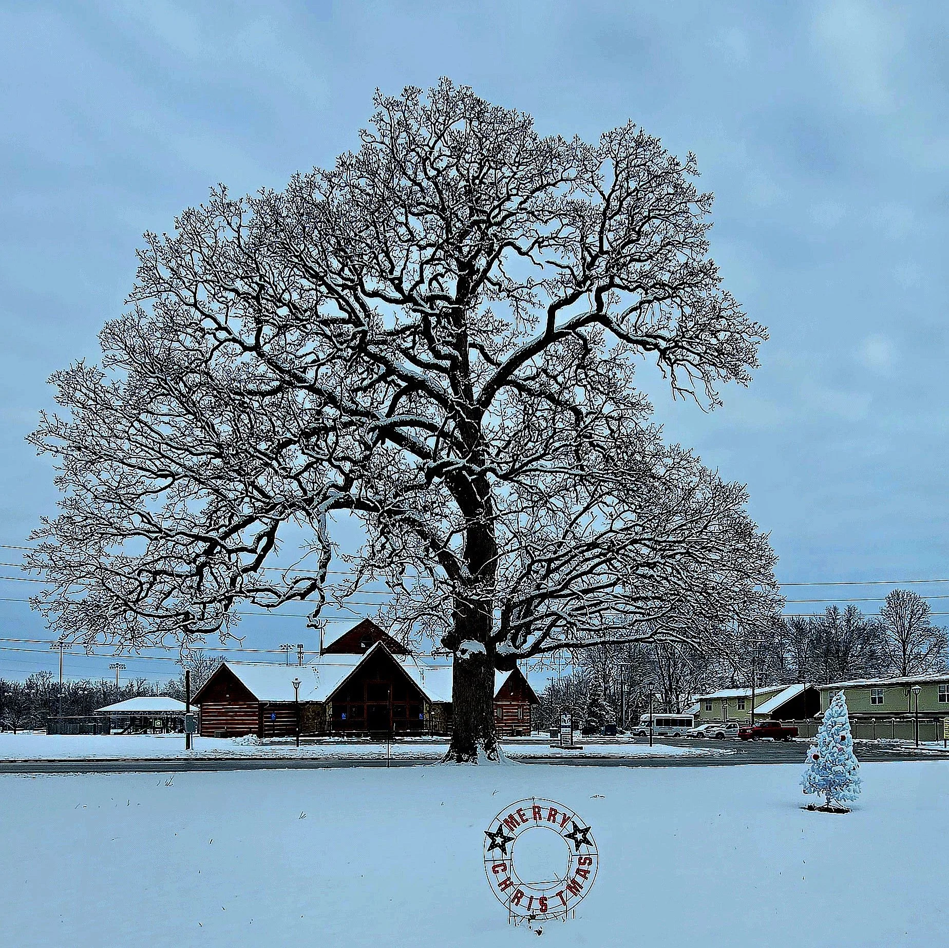 Likewise, in nearby Memorial Park, holiday decorations were enhanced by wet snow.