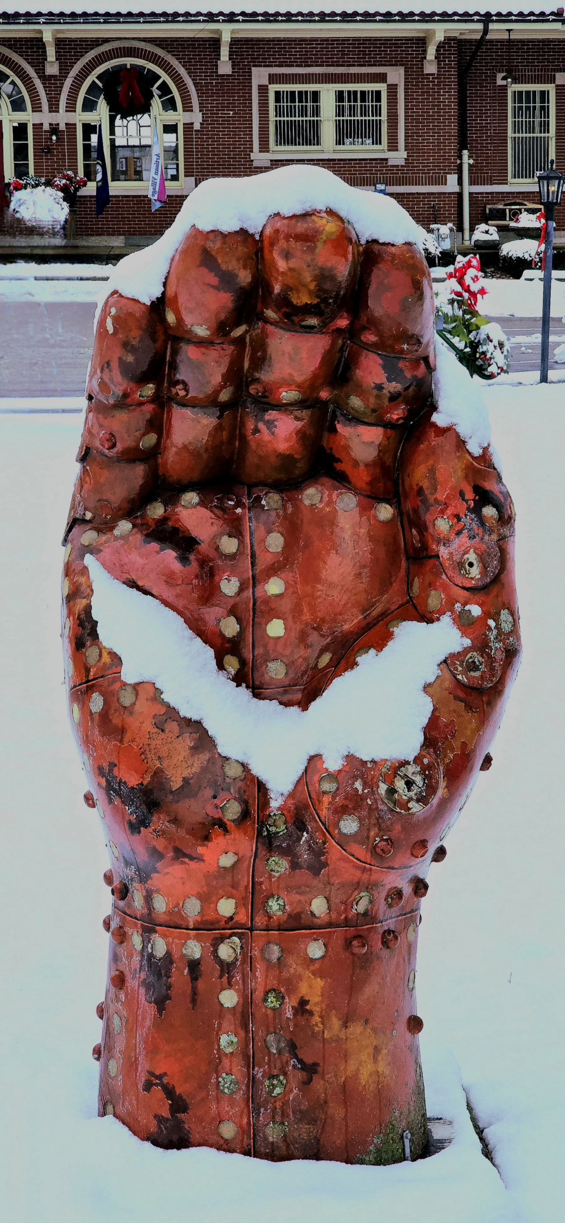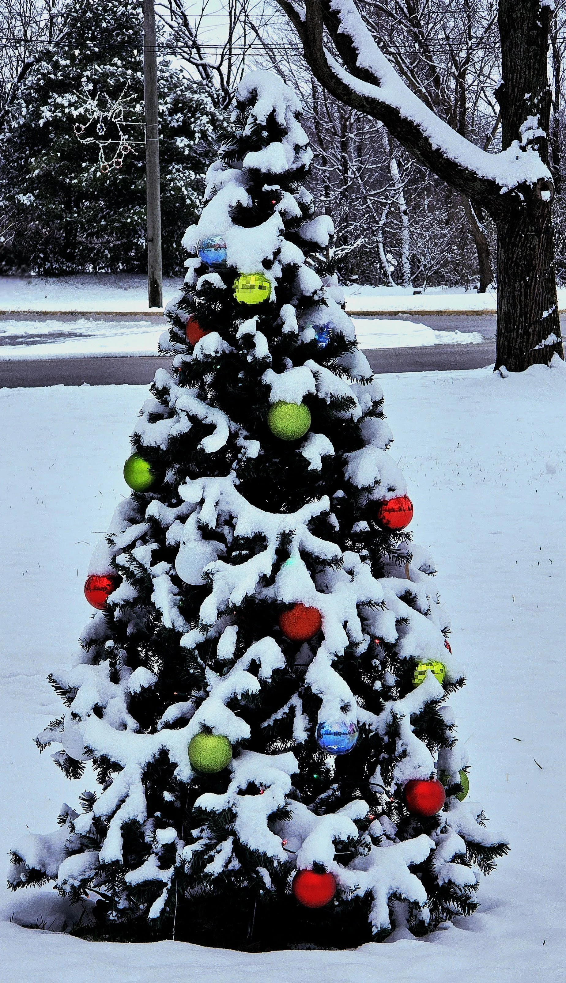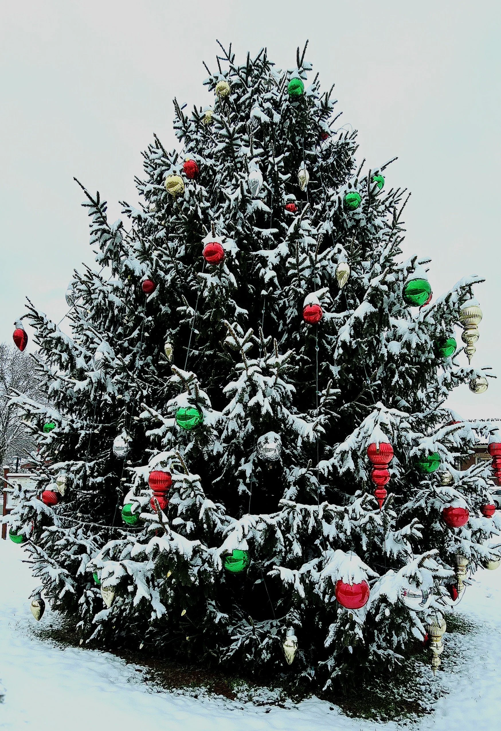 In Memorial Park, holiday decorations were enhanced by wet snow.